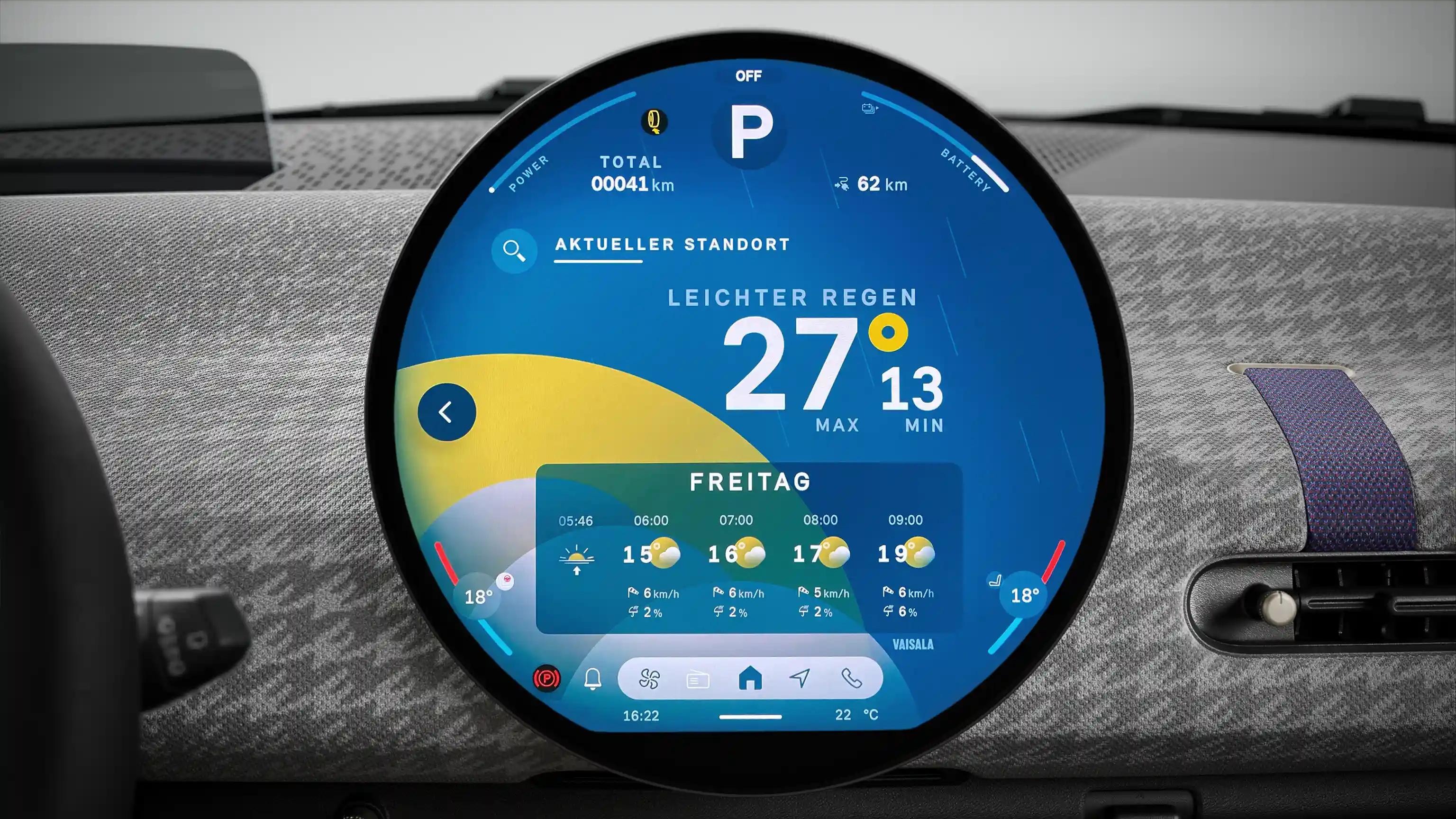 Het iconische centrale display met een diameter van 240 mm van hoogwaardig glas is zowel je instrumentenpaneel als je infotainment- en assistentiecentrum. Het is tevens ‘s werelds eerste ronde display.